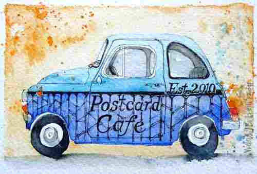 Welcome to the Official Homecoming of the Fiat 500 “Topolino” postcard, designed to celebrate the First Birthday of Postcard Cafe earlier this year. Reflecting the Industrial Pier of the Postcard Cafe mast-head, the pale blue sky, and deep blue sea, we all feel it is a real gem, and even, as we say locally “Bloody Good” !