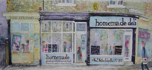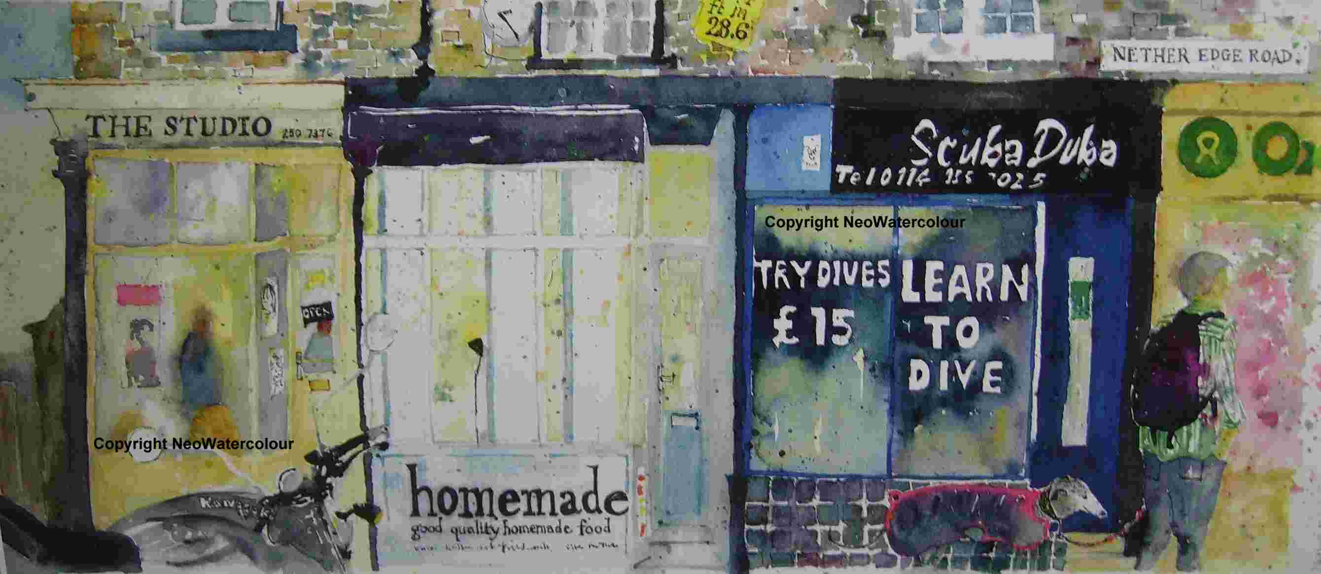 Latest watercolour of Nether Edge Road, updated from 2009 version below, since Scuba Duba swam off into the sunset and Homemade expanded with a new Deli. Is that food supremo, Nigel Slater, wandering into view ? The Scuba Duba version features “Dog” a local rescue greyhound.