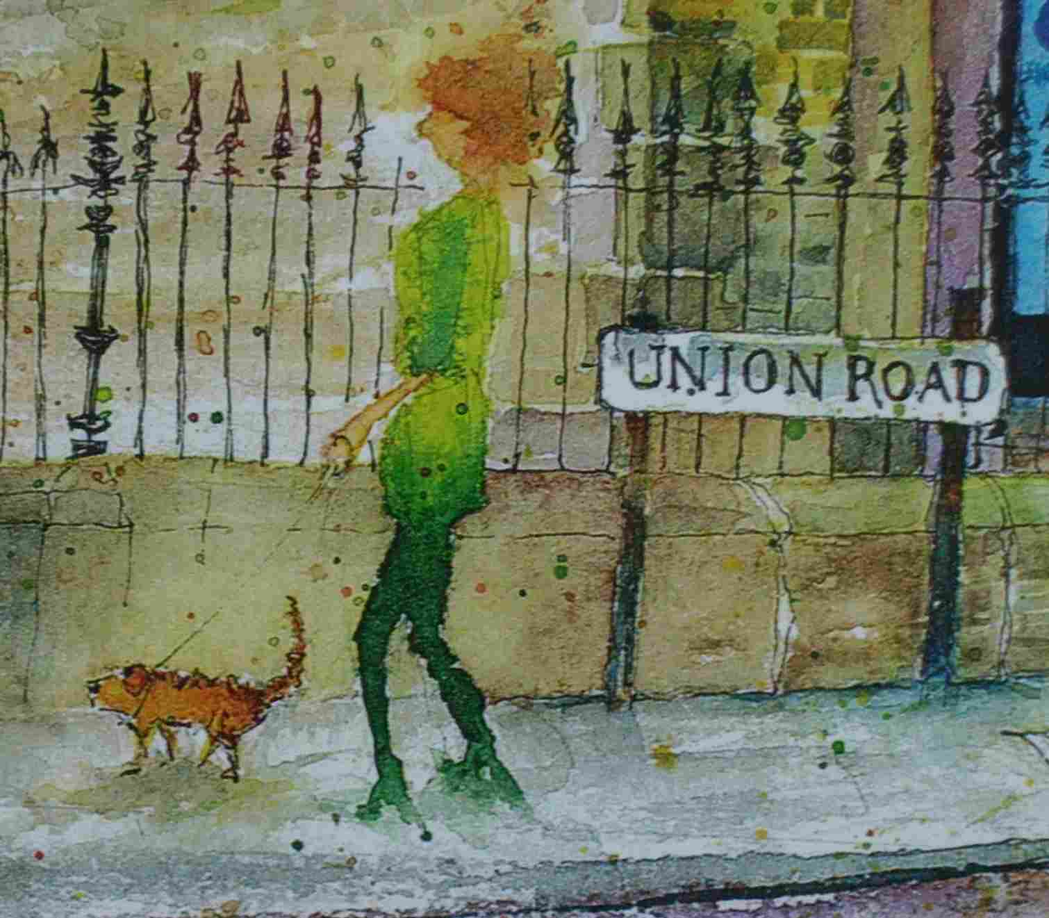 brilliantly named by my Avant-Garde friend today at the Farmers Market. From my “Union Road/New Habits” painting. We don’t know the dogs name, but he has that sizzly, electrified look of Roobarb from the cult 70’s cartoon (Roobarb & Custard).