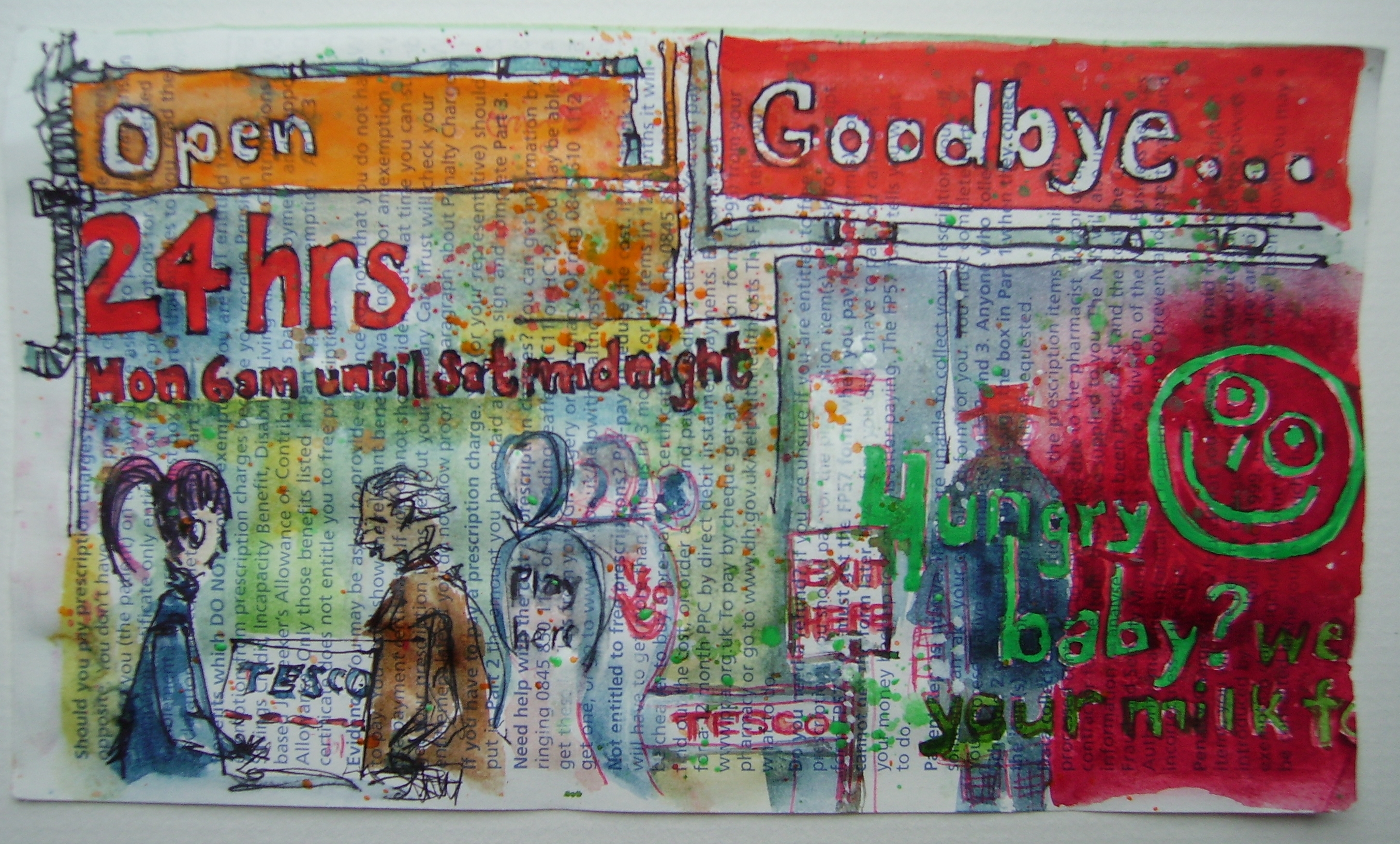 ……..and other signage overload. Sketch at Tesco today ( yes, the checkout operator did have pink hair)