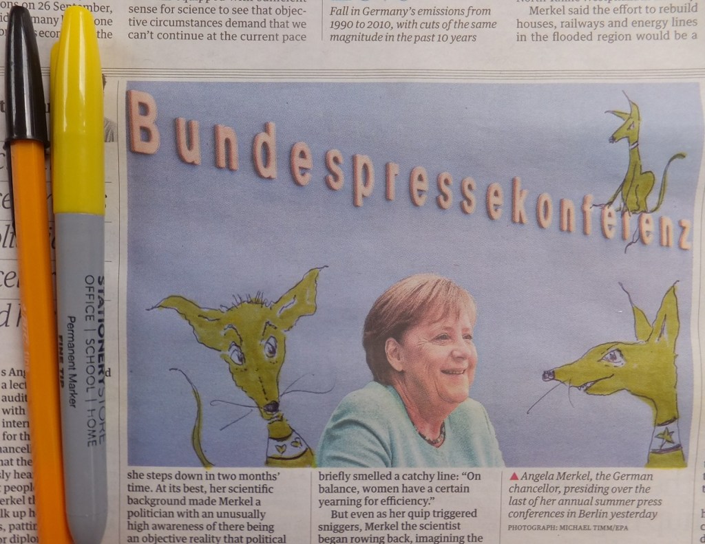 …. improvised drawing on “found object” – The Guardian newspaper – with yellow Sharpie and black Bic ballpoint (had forgotten to take my usual drawing equipment with me !) ….