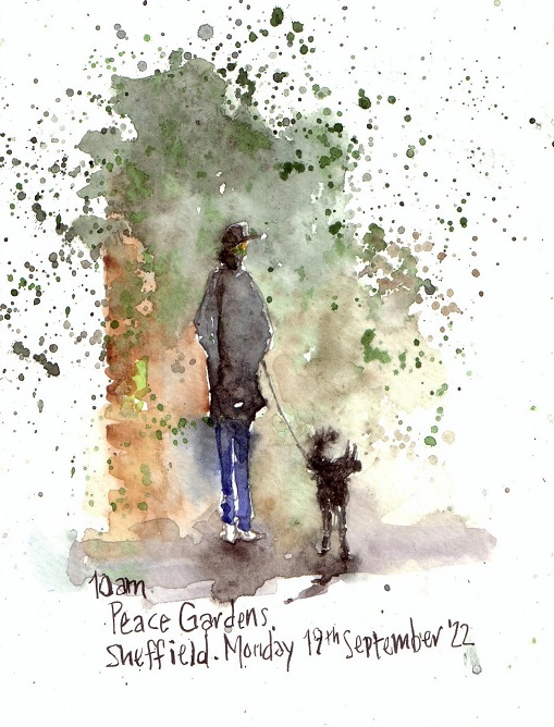 … walking through the Peace Gardens in Sheffield. The man & his dog were there at 10 am, walking in the drizzle…..