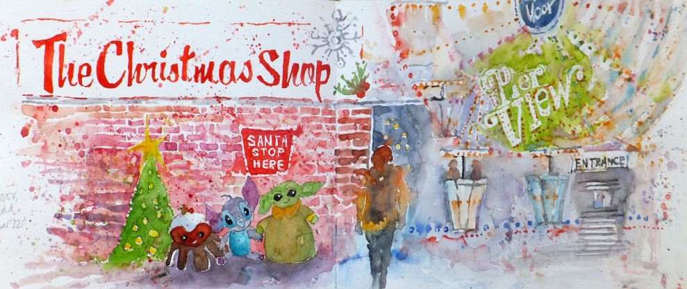 … my painting of The Christmas Shop, a seasonal “pop-up” shop on The Moor, Sheffield, and the pop-up “Llandudno Pier” Giant Ferris Wheel ! … Won First Prize at Heeley Art Club’s Christmas Meeting this year !