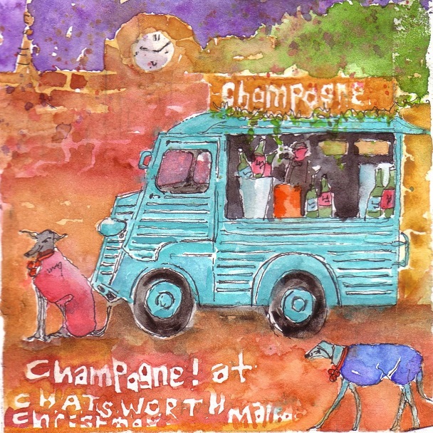 more ! .. A Citroën “H” Van …. Whippets … a Land Rover Defender…. an Enchanted Garden with Owls and Deer ! … all my favourite things ! … and perfect for my first 3 “Days of Christmas”, based on Chatsworth, which is my favourite place and always a joy to visit, and paint….