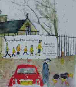 …….a slice of an emerging painting………this element features Sheffield Childrens Hospital (old & new), with mascot Theo the Bear, and the Royal Hallamshire Hospital in the background. In future slices……….a possible splash or two of Hendersons …….. ?