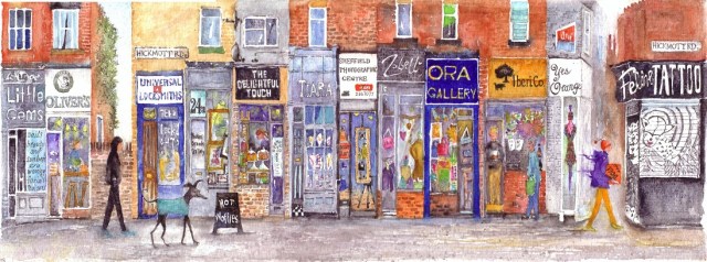 …. not just frames ! .. Ready made or bespoke, all colours and a huge selection of mounts….AND prints…and cards !….. and all with the most friendly service, backed up with over 30 years of experience …. this little frame shop opened recently, and I had to paint it – the lettering and design is right up my street !